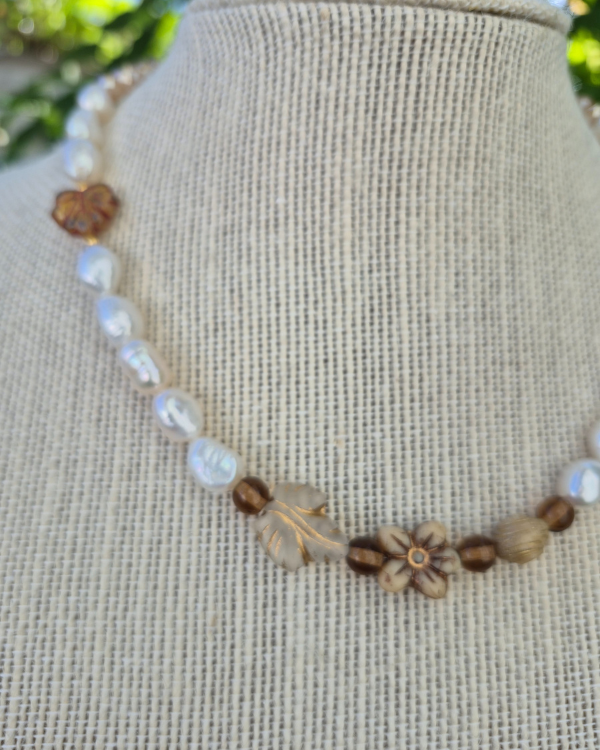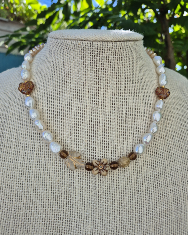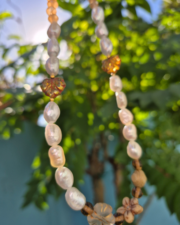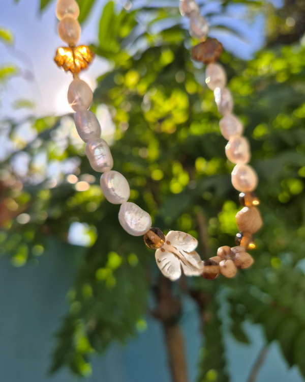 Mide 15" y tiene extensión de 2". Hecho con piedras semipreciosas, perlas de agua dulce y cristales checos.