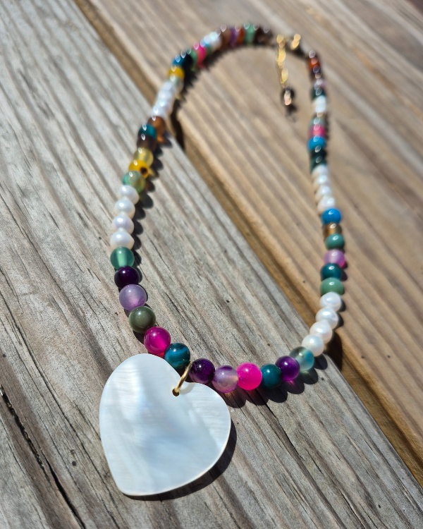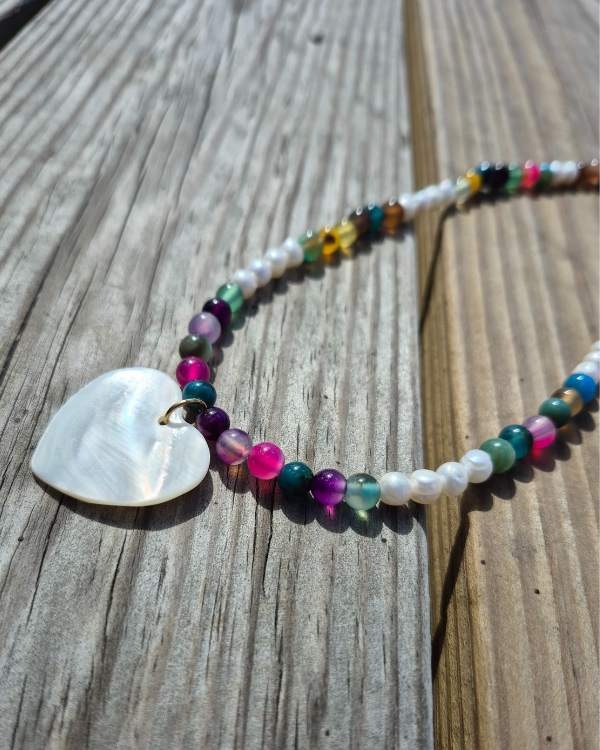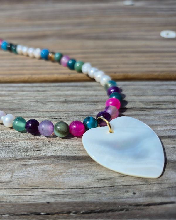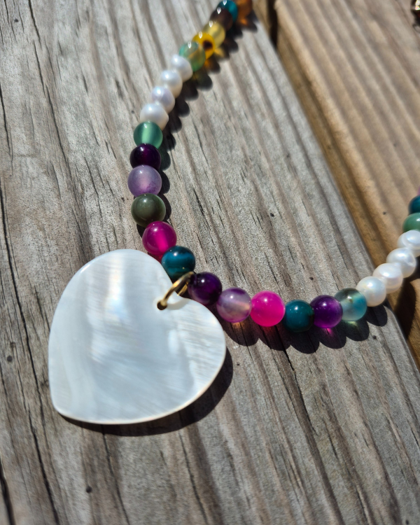 Armonía es un collar creado con piedras jades multicolores, perlas de agua dulce y un corazón en madre perla. Este collar es la representación de que aunque seamos diferentes, estamos en nuestro lugar correcto, en el proceso de amarnos sin límites.