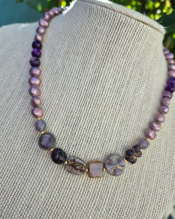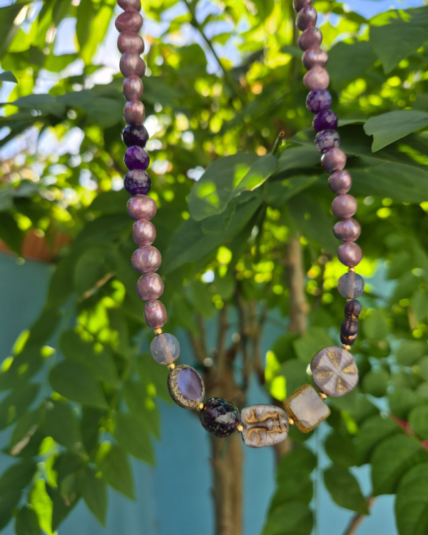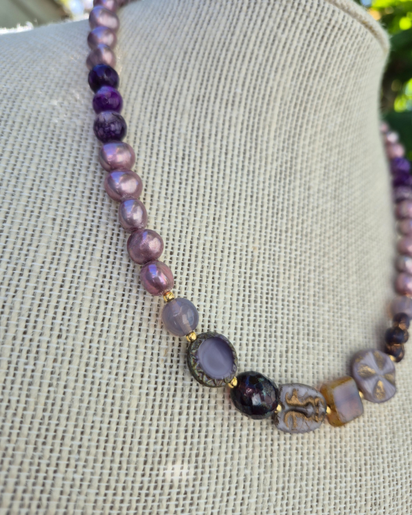 Mide 16" con 2" de extensión y está hecho con perlas de agua dulce, jade y cristales checos.