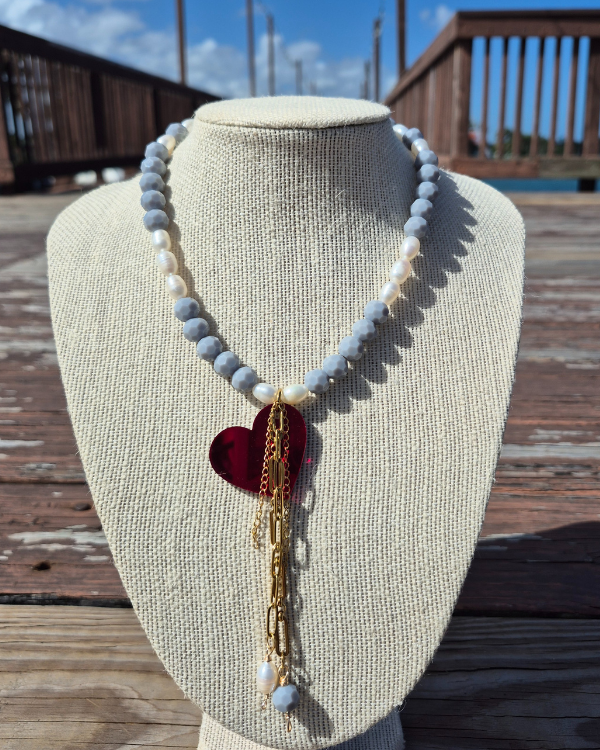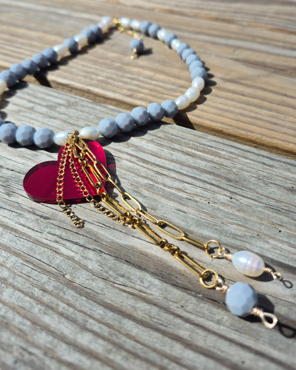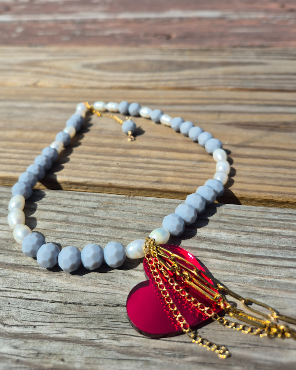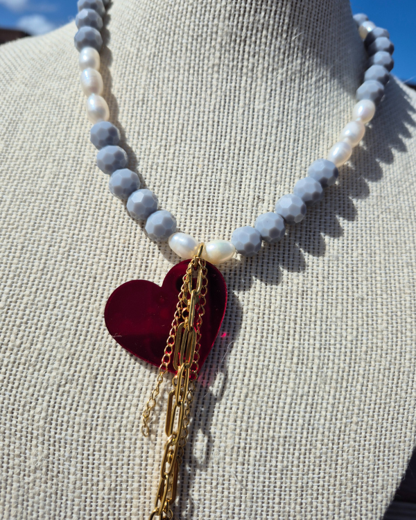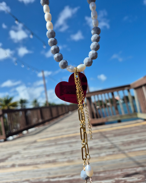 Equilibrio es un collar creado con piedras semi preciosas y perlas de agua dulce. Tiene un dije de corazón rojo en acrílico con unas cadenas colgantes en acero inoxidable. Este collar es el perfecto para recordarte que la calma y la pasión pueden coexistir.