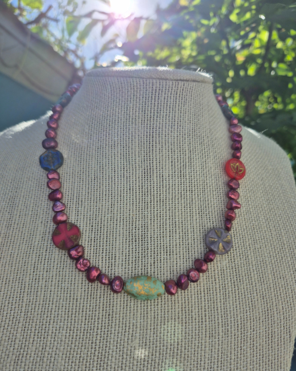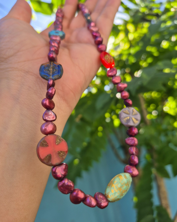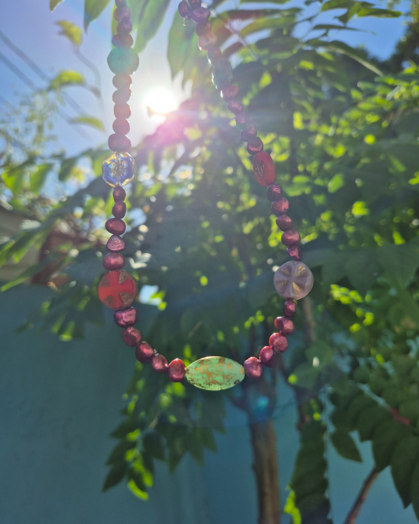 Hechizo es un collar que captura miradas al instante. Combina los cristales checos con las perlas de agua dulce en violeta dándole ese toque que cautiva al instante.