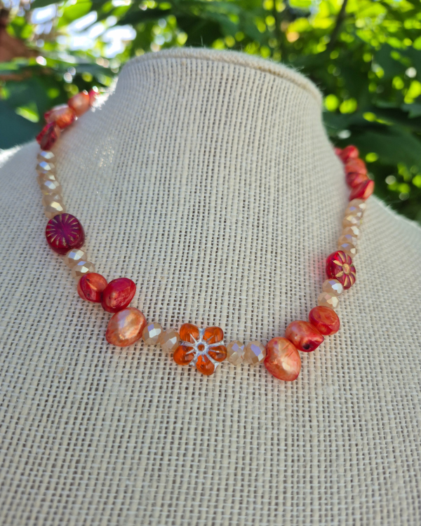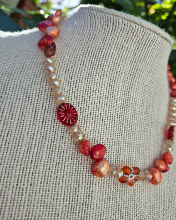 Mide 14.5" y tiene 2" de extensión. Hecho con perlas de agua dulce, piedras semipreciosas y cristales checos.