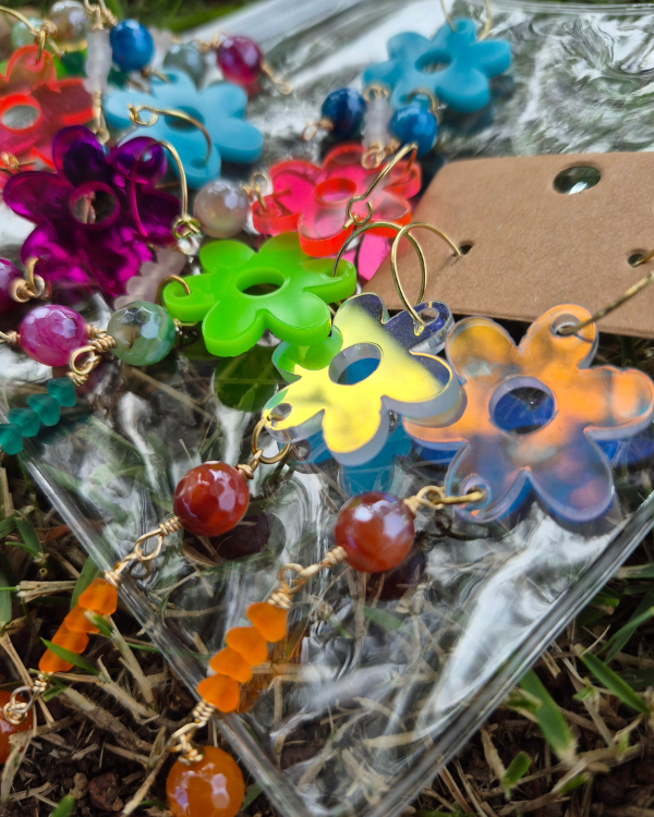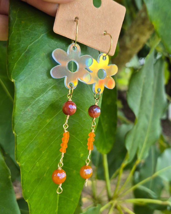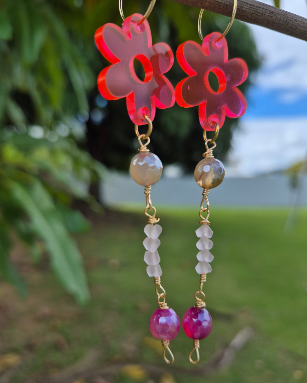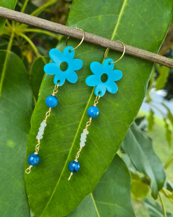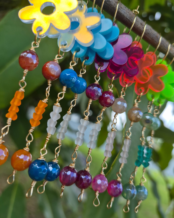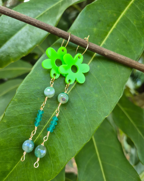 Primavera son unos aretes espectaculares para llevar contigo y elevar tus outfits está primavera. Son sumamente livianos confeccionados con acrílico y piedras jade.