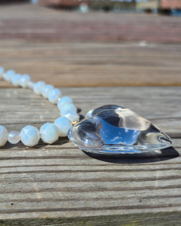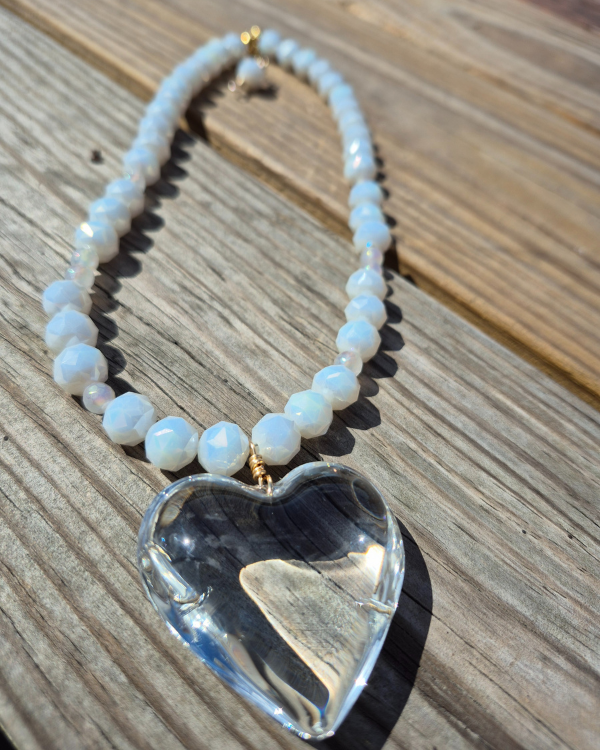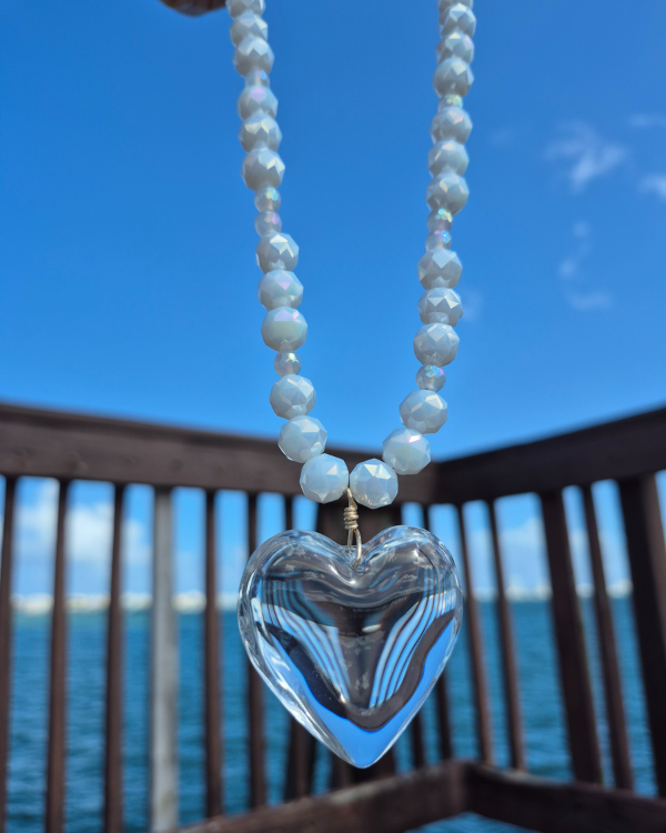 Raíz es un collar lleno de delicadeza que busca recordarte que quien te sostiene es Dios, y que su amor te hace grande. Que tu amor crece cuando reconoces quien eres en El. Esta creado con piedras semi preciosas en blanco con destellos y un dije de corazón en cristal.