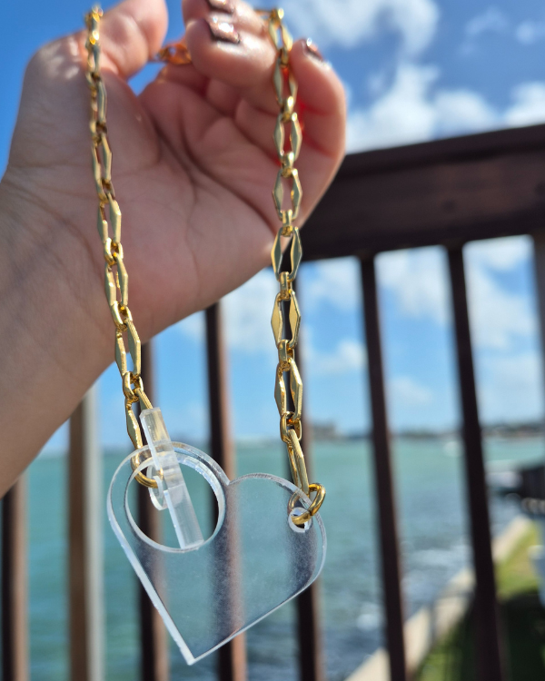 Está confeccionado con cadena en eslabones en acero inoxidable y la cerradura en acrílico. Mide 15" de largo y no provee extensión.