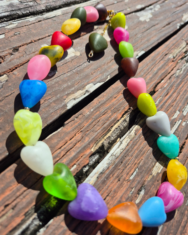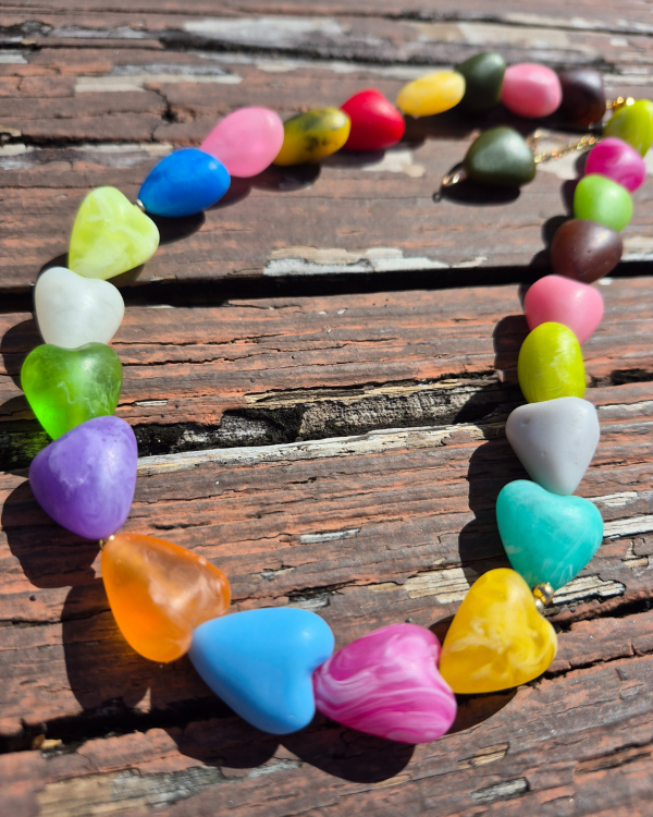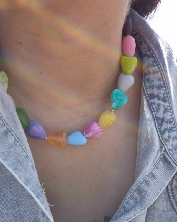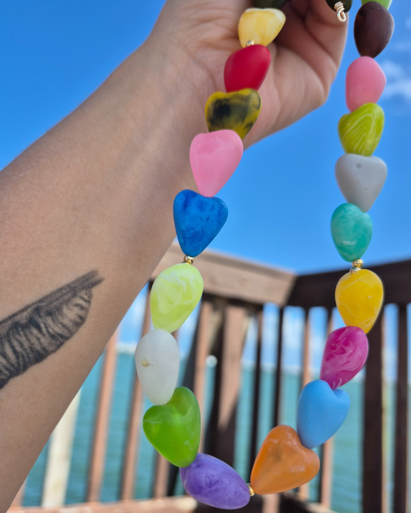 Viva es un collar lleno de colores, brindandote así el recordatorio de vivir amándote con sonrisas y sin reglas. Que jamás olvides que el amor propio no tiene límites. Creado completamente con corazones de resina en diferentes colores, te elevará siempre.